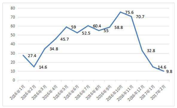 2016年1月—2017年2月成都限购区域新增供应量走势图