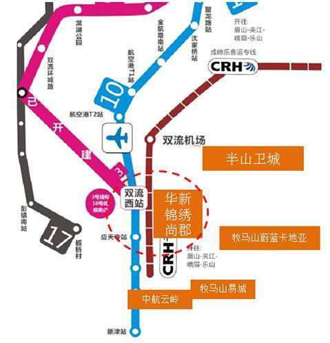轨道交通向来是业内投资人士关注的首位要素,一个区域乃至项目的发展前景受到交通尤其是地铁的极大影响。犀浦及龙泉就是最好的例证,在地铁2号线东西沿线开通之后,两区域的市场热度一路走高,成为承接主城外溢客群的主力区域。而在下图交通线路图中可以看到,地铁3 号线的城铁双流站以及地铁10号线的应天寺站,恰好环绕在华新锦绣尚郡,其中城铁双流站作为换乘站对于人群聚集有明显作用。值得一提的是,地铁10号线预计将于今年国庆节前开通,这势必将成为该区域价值提升的又一砝码。此外,项目对面就是成绵乐快铁及拟定修建的双流客运站,极大的缩短了城区通达时间。华新锦绣尚郡作为双流稀缺的600亩纯低密大盘,恰好享有两大地铁站点环绕,占据低密、交通、资源等多个高改市场优势,自然对高端改善客群有极大的吸附力。