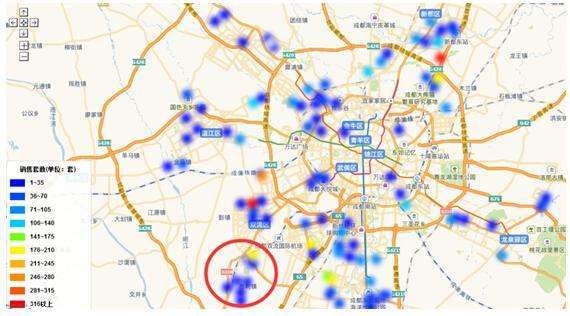 那么哪些项目在双流高改市场中率先尝到市场甜头?从锐理数据调取2016年至今成都别墅类项目销售热度图(颜色越偏红销量越高),发现双流区域内的别墅销量主要集中在下图红圈内区域,且其中有一个晃点尤为显眼,销量远高于周边市场。