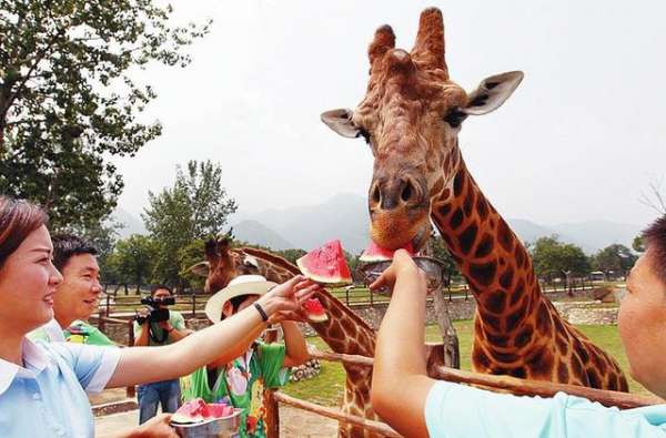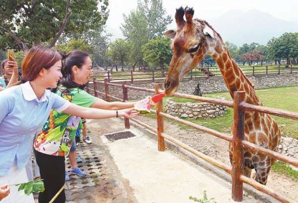 工作人员喂长颈鹿吃西瓜降温 本报记者马昭实习生张宏涛摄