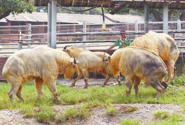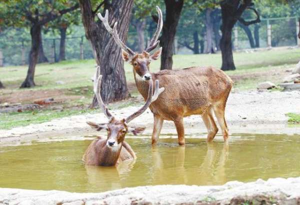 昨日上午10时许,伴随着闷热的天气走进秦岭脚下的野生动物园草原区,两头羚牛正站在水池中央,享受着从头顶喷淋而下的泉水带来的清爽,时而伸长脖子抖动着全身的水珠,时而望着旁边两位将头顶在一起嬉戏打斗的同伴。4只羚牛宝宝则卧在凉棚下,警惕地观察着游人的一举一动。