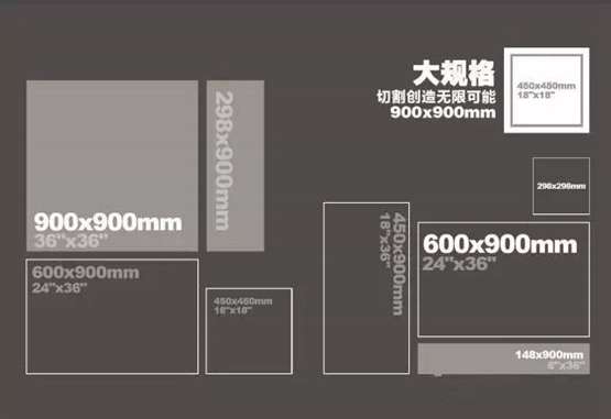 大规格设计,不是单纯为了“大”而“大”,而是“大”得有好处,大尺寸规格设计能更好满足多种切割应用,例如300*300mm、450*450mm、450*900mm、300*900mm、600*900mm、225*900mm、675*900等多种常用规格,铺贴更灵活,为设计师提供更广阔的设计空间。