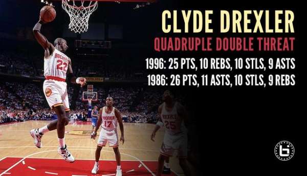 以官方统计为准,NBA历史只有四名球员拿到过四双,即便NBA第一人乔丹,也未能达标。乔丹曾非常接近四双,他在1989年1月15日对凯尔特人的比赛中,获得了42分9篮板11助攻8抢断,差一个篮板和两次抢断达成四双。德雷克斯勒有两次与四双擦肩而过,分别是1986年1月10日对雄鹿26分9篮板11助攻10抢断,1996年11月1日对国王25分10篮板9助攻10抢断。对国王那场球,德雷克斯勒终场前16秒传球给左侧底线的特雷西-摩尔,结果摩尔跳投偏出,“滑翔机”错失四双。