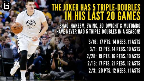 约基奇单赛季5次砍下三双,奥尼尔、奥拉朱旺、尤因、莫宁、霍华德和穆大叔都未曾做到