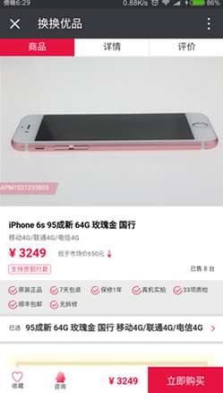 我们来做一个比较,一部玫瑰金、64G国行、全网通的iPhone 6s手机,在换换优品上选择95成新,售价是3249元。95成新的手机,使用痕迹很少,跟一台全新机区别不大。