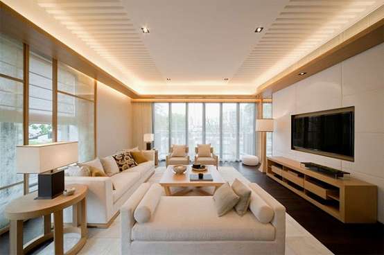 筒灯的位置和数量根据结构尺寸灵活设置,灯具可以同新风系统、中央空调系统和家庭影音系统部分设备一起集成在吊顶里面,使空间看起来整齐、有序。减少吸顶灯和吊顶占用顶面空间而带来的压迫感,适用于房高3米之内的房型。吊顶需要整体下吊10公分左右作为筒灯的安装空间。层高降低,造价增加。