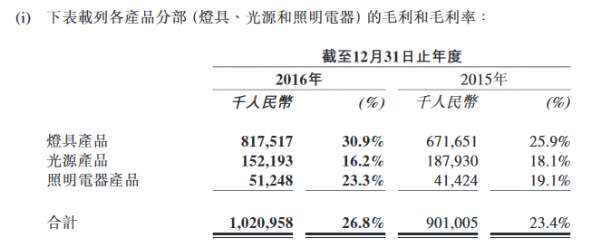 于报告年度内,实现销售毛利为人民币10.21亿元,与同期比较增长13.3%,销售毛利率从23.4%升至26.8%。就各产品分部来看,灯具产品毛利率从25.9%上升至30.9%,主要得益于报告年度内本集团实施的全面降成本措施,包括加强库存管理、推行自动化改革及精简组织结构等,使整体成本得到有效控制;光源产品的毛利率从18.1%下降至16.2%,主要是传统光源产品产能不饱和以及为稳定客源给予客户更高的价格优惠,导致毛利率下降;照明电器产品毛利率从19.1%上升至23.3%,这主要得益于本集团推行的全面降成本措施,以及外销产品受益于美元持续升值的利好因素。