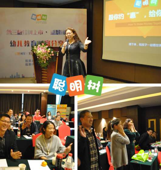 知名早教聪明树公司董事刘总和李总亲自到场,为大家解读了如今的早教市场和聪明树的心路历程和未来发展战略。7月26日,知名早教机构聪明树成功登陆新三板,公司股票代码(838468)),企业从一家传统的儿童教育机构,迈出了幼儿教育信息化和资本市场的第一步,未来,聪明树会更加大刀阔斧开拓市场,带给各位合作伙伴更好的品牌效应和实惠。