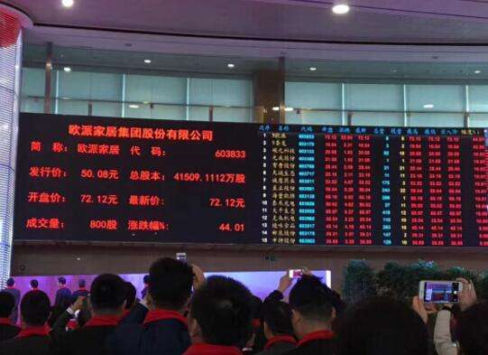 据悉,欧派家居此次发行总数为4151万股,网上发行1241万股,发行价格:50.08元。今日开盘后,便以44.01%增幅一路飘红涨停。欧派家居作为引领整体家居行业消费升级的龙头企业,在发行询价阶段即受到资本市场热捧,此番上市,市值已达299亿,名列整体家居行业前茅。