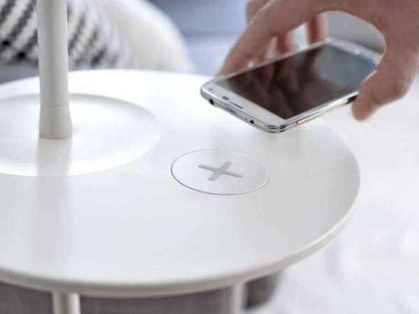 早在 2014 年,宜家在民主设计日上首次推出了智能家居系列产品\u00A0Home Smart,这是一系列支持无线充电的家具,包括咖啡桌、床头柜、台灯、落地灯等,你只需将手机放到那个那个圆形的白色加号上,手机屏幕会立即出现充电的提示。
