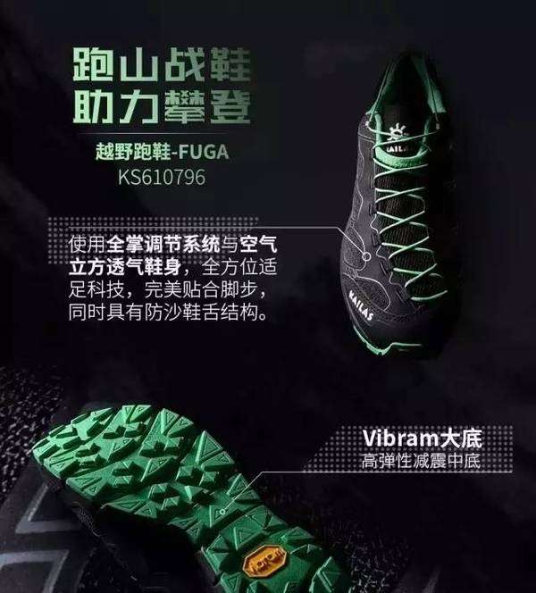 KAILAS FUGA Ⅱ采用的是Vibram最新的橡胶配方 Megagrip鞋底。Megagrip的目的是解决Vibram鞋底在湿滑表面上的通过性这一问题。经过上百次配方试验和测试,Vibram Megagrip橡胶配方解决了必需湿滑表面摩擦力的户外活动难题,正在成为越野跑鞋鞋底的新一代标准配置。