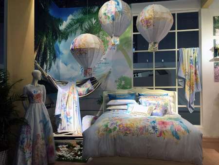 凯盛家纺的展馆,以新颖的创意,高端的设计与布置,吸引了来访者的眼球。近300平方米的展厅以欧式风格为主,以白、蓝、紫为基色调。展馆外形,情景化打造出优雅醒目的一对白翅膀,在山脚下准备飞入山顶,带你体验云端轻松舒适的感觉。“飞上云端“的概念也成为众人的焦点,来宾纷纷与之合影,成为展会当天的”人气网红“。