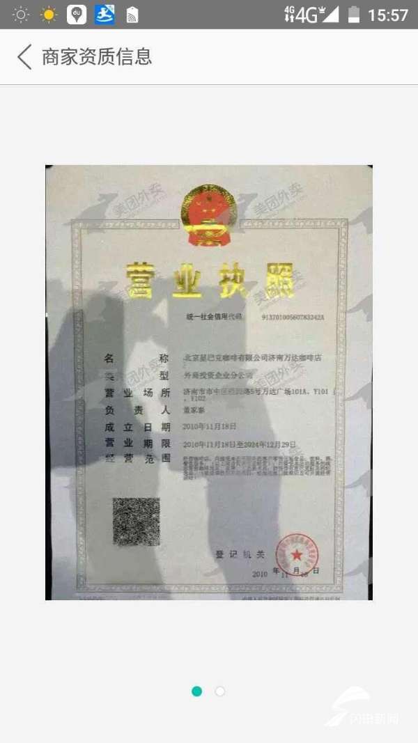 随后,记者在美团和饿了么搜索星巴克,都显示多家门店有外卖服务。但是饿了么后面显示代购字样,而美团后面不仅没有代购标示,还有星巴克的营业执照。