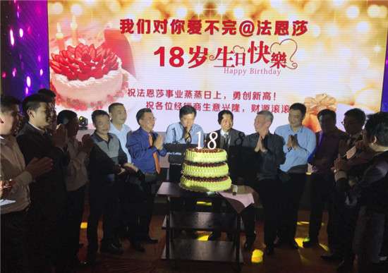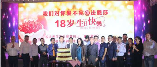 此次峰会亮点之二是,自1999年法恩莎进入中国区至今,已有18年,所以2017亦是法恩莎卫浴的十八周岁,年度峰会上,所有法恩莎人共同见证法恩莎的18岁,许下愿望,恭祝法恩莎在未来更加璀璨!这十八年来,法恩莎卫浴在中国区一路高歌,霸气开疆扩土,在国际舞台上熠熠生辉!礼遇十八,我们感恩所有法恩莎人携手共进,用匠心缔造精品,以专业铸就品牌!
