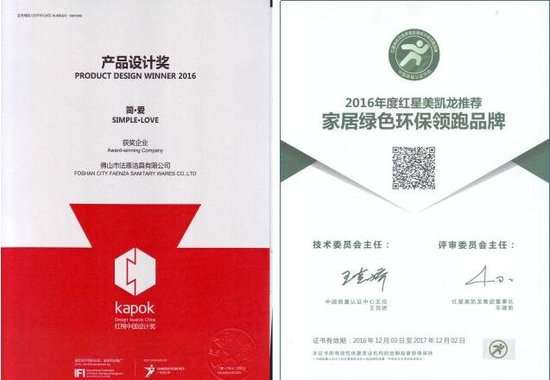 2016年12月月初法恩莎卫浴在广州琶洲展顺利展出最新“中国红棉产品设计奖”得主产品--简爱系列,该系列产品整体设计清雅飘逸,传达出“轻生活”的真谛,揽获无数观展者的芳心。期间法恩莎卫浴又获得红星美凯龙所推选的“家居绿色环保领跑品牌”称号,是行业内唯一一家获此殊荣的企业。