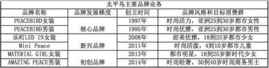成立于1996年的太平鸟,最初以做男士衬衣起家,目前整体定位为时尚“中档休闲服饰”。其旗下主要有六大品牌,分成核心、新兴和初创三个梯度,以应对细分市场的差异化需求,相互补充,交错发展。此外,太平鸟还于2015年入股了法国设计品牌AlexisMabille。