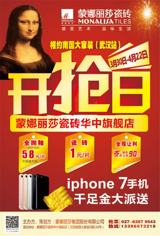 开春盛宴,湖北蒙娜丽莎瓷砖联合蒙娜丽莎瓷砖工厂总部监督,委派深圳市龙盛智业企业管理咨询服务有限公司操盘执行,“4.22开抢日”湖北区域于于武汉南国大家装建材市场蒙娜丽莎文艺复兴馆拉开帷幕。这是广大湖北业主的福音!