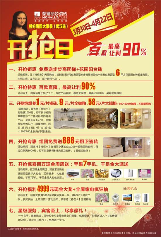 缤纷的活动,您心动了吗?那就抓住蒙娜丽莎瓷砖此次大型惠民活动,用最少的钱,把房子变成家。爱家,那就马上行动吧。