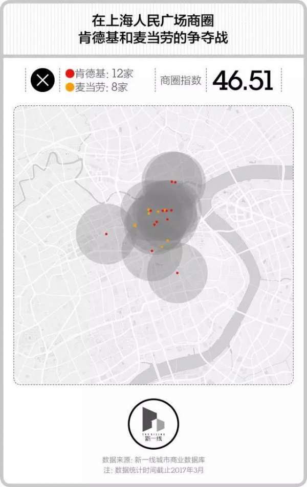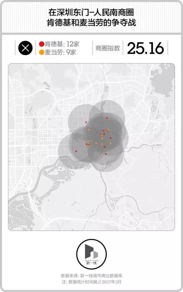 在2公里×2公里左右的范围内,深圳的东门-人民南商圈共有12家肯德基和9家麦当劳,这些门店之间大多相距两三百米,其中最近的是麦当劳光华分店和肯德基新园餐厅,只有174米。