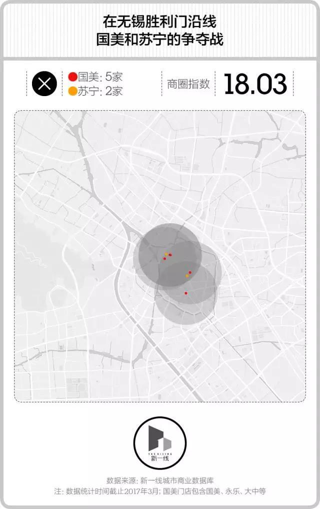 消费频次相对较低的国美和苏宁尚没有如此密集地参加搏斗。但在无锡的胜利门区域,你也会看到国美和苏宁几乎挨着开店的策略,并且仅仅相隔1公里,它们就又成对地出现了。