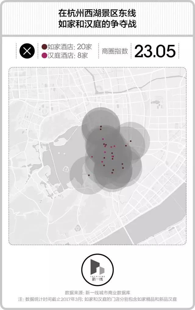 而在几乎同样的面积范围内,杭州西湖景区的东线挤进了20家如家酒店和8家汉庭酒店。仅是在延安路庆春路这一个路口,就集中了3家如家和1家汉庭。这里的争夺甚至超过了快餐店的激烈程度。