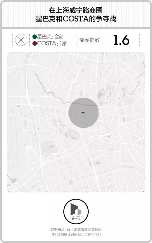 这是两个等级差异明显的商圈组,留意下右上角的商圈指数就知道了。在上海顶级商圈南京路-人民广场区域,51家星巴克力压7家COSTA;而到了社区商业中心威宁路,COSTA与星巴克的门店家数就只相差1家了。