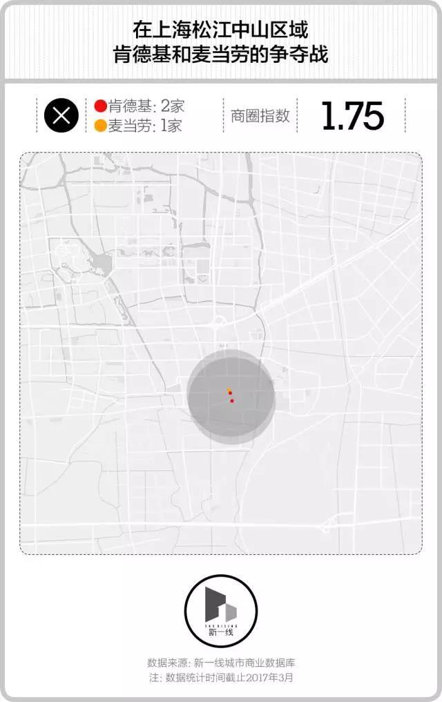 在与威宁路商圈指数相当的松江中山区域,肯德基和麦当劳的配置与星巴克和COSTA之间完全一致,都是2:1。但回到人民广场商圈,肯德基和麦当劳的差距依然没有全面拉开——12:8。