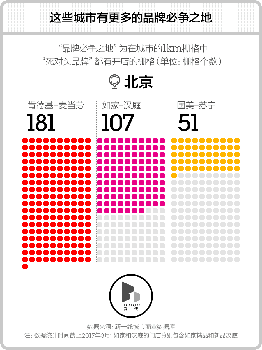 于是,新一酱统计了下肯德基vs麦当劳,如家vs汉庭,国美vs苏宁这三对品牌在各个城市的必争之地有多少块。这里“品牌必争之地”指的是,当把城市画成1平方公里大小栅格后,那些一对“死对头品牌”都有进驻开店的栅格。