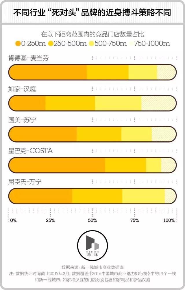 行业间的差异还体现在各对品牌的搏斗到底要“贴得多近”上。新一酱顺手分析了5对品牌门店之间的距离,餐饮行业明显需要在500米范围内与对手正面交锋,家电和药妆零售与对手的距离也不能隔得太远,酒店品牌则可以在1公里范围内的任意空间里发动袭击。