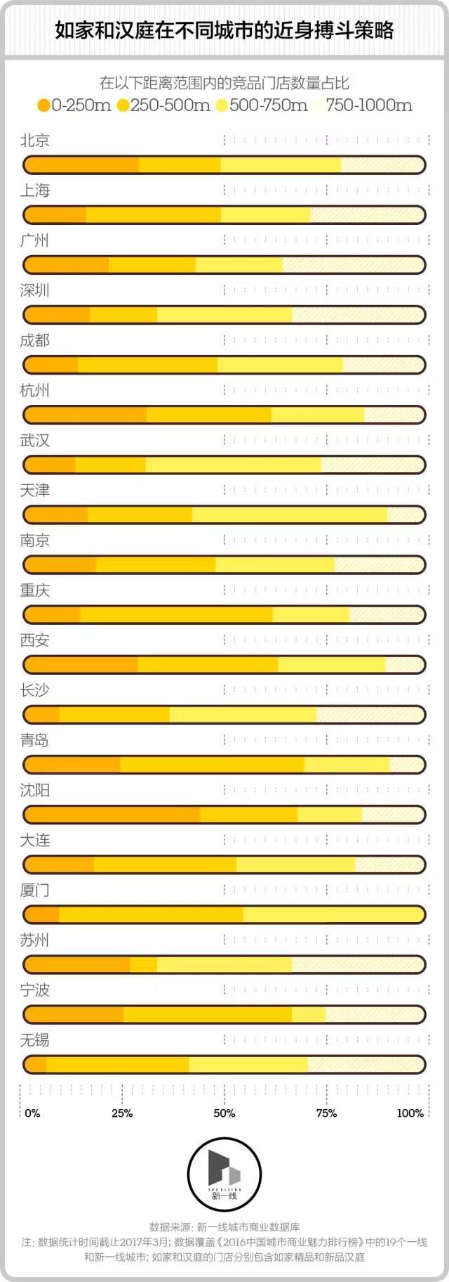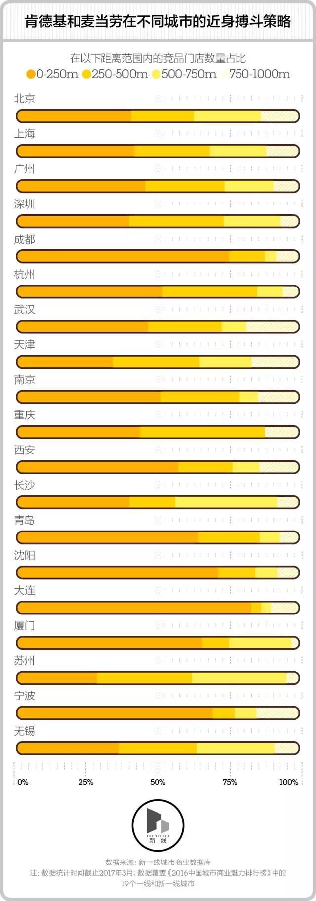 但新一酱不太明白的是,19座城市综合起来看到的这种距离策略,细分到具体城市时,却又有很大的差异。比如在沈阳和大连,百分之七八十的肯德基和麦当劳距离都在250米之内,而在厦门和无锡,如家和汉庭却基本不会紧挨着开店。聪明如你,能告诉新一酱,这些城市之间的差异是怎么发生的吗?