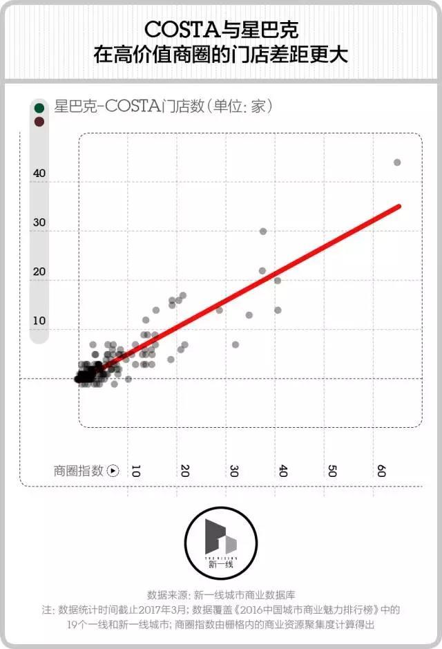 当商圈指数更高时,星巴克与COSTA的门店数量差异就会越大,它们之间有明显的正相关。而到了肯德基与麦当劳对比时,这样的正相关关系并不明显,无论在什么样强度的商圈内,这两个快餐品牌的门店差距都控制在10家以内。也就是说,COSTA之所以比星巴克弱势那么多,关键在于它在高价值商圈的门店数量无法紧跟星巴克的强势扩张。