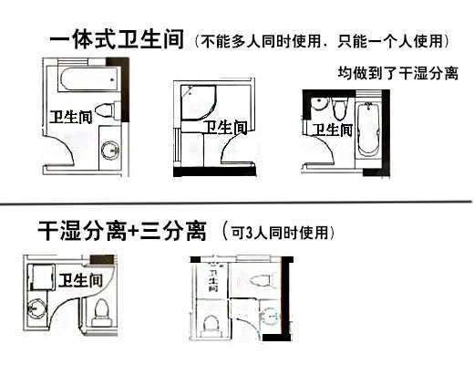 卫生间的门不要对着大门;卫生间的门不能对着餐厅,里面的气味会影响食欲;卫生间的门也好不要正对着客厅,家里人的举动闯入来客的眼帘,多少有些尴尬;并且卫生间也不能安排在下层住宅的客厅、卧室之上,流水声会对日常生活产生干扰。目前卫生间的设计、功能分区主要如下: