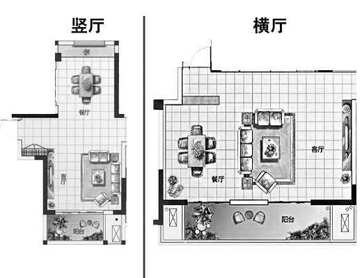 就客厅的使用情况来看,客厅的面积一般在14—23平米左右,进深在3.9—5.1米,面宽在3.3—4.5米为宜,含有餐厅的客厅面积可达18—27平米。目前,客厅的类型主要有横厅和竖厅: