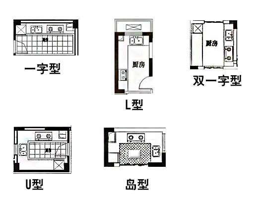 小的户型,一般采用一字型的厨房;中户型,大多采用L型或双一字型;大户型一般采用U型;豪宅一般采用岛型。