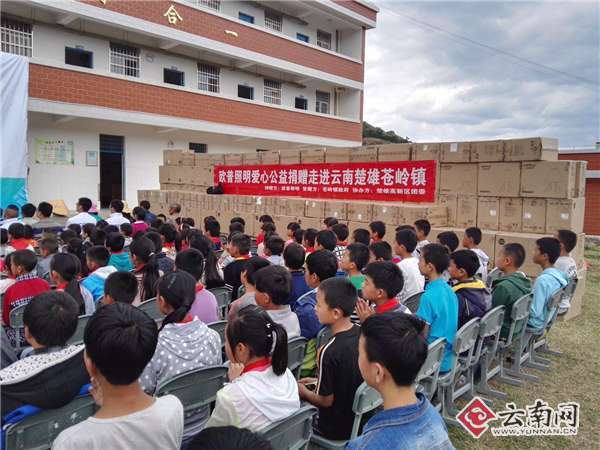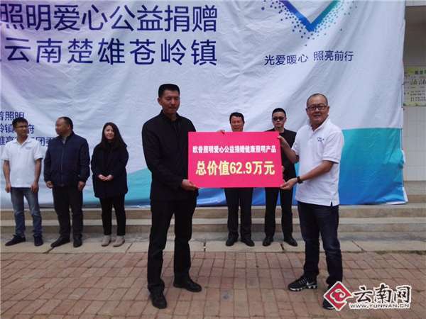 4月7日下午,欧普照明新农村房屋灯光改造暨爱心公益捐赠仪式在楚雄彝族自治州楚雄市苍岭镇西云完小举行。在此次捐赠活动中,楚雄市苍岭镇358户870名贫困群众和1457名在校学生收到了欧普照明捐助的灯管、灯泡、吸顶灯、台灯等总价值近63万人民币的7725个灯具。
