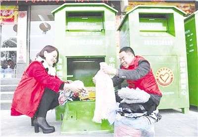 惠长坡和志愿者在旧衣回收箱整理衣物