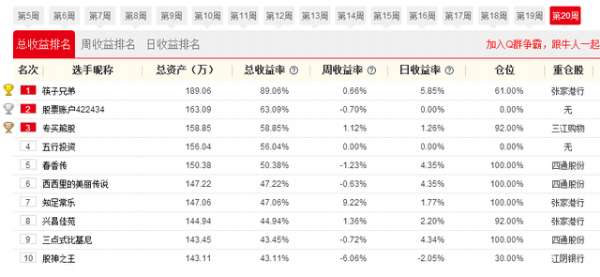 再从总收益榜上看,选手“筷子兄弟”继续以89.06%的收益位居冠军,其再度回归次新银行股。选手“股票账户422434”则以63.09%的收益位居亚军,该选手目前选择了空仓。而选手“专买熊股”以58.85%的收益率获得季军,其继续持有三江购物。在此对以上选手获得的好成绩表示祝贺!