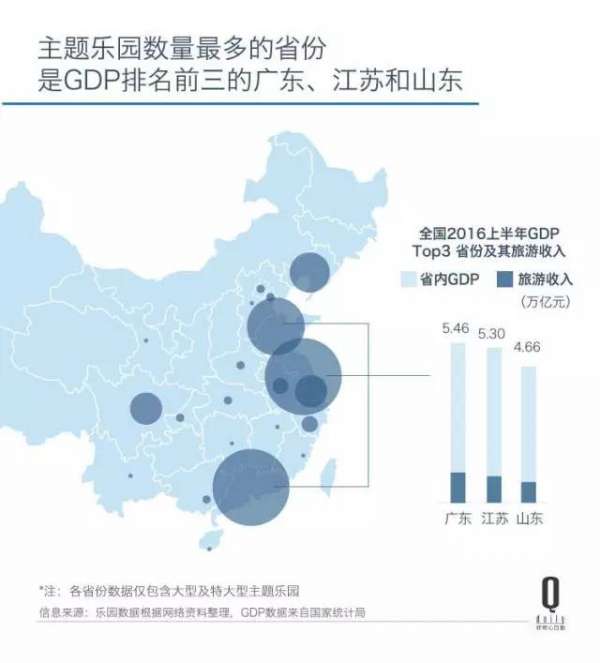 2015年,中国人均GDP超过8000美元,大型城市如上海的人均GDP已达1.5万美元。以地区经济为指向的主题乐园集中围绕着中国的几大经济圈分布:珠三角、长三角、京津冀以及环渤海区都是大型及特大型主题乐园最密集的区域。其中,地区生产总值位列前三的广东、江苏和山东省,也恰好拥有最多乐园。