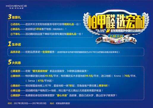 本次举行“怕甲醛,选宏耐——3?15宏耐美育圆梦中国行之品质行”活动,意在帮助广大消费者如何选择优质的地板,这是宏耐自身产品实力与服务实力的双重展示,更是作为行业领头羊的担当态度。届时,宏耐地板将在活动中推出诸多福利,如此给力的优惠精彩不容错过。不仅如此,在“怕甲醛,选宏耐——3?15宏耐美育圆梦中国行之品质行”活动中,宏耐地板还将为消费者推出3大豪礼和5重优惠,多种特供地板、进口地板和星座地板都将以特价或超大的优惠价出售,还有34款“醛无星座地板”新品首发,并且宏耐地板还将为消费者提供1生的品质承诺,让消费者享受一生的保修服务。