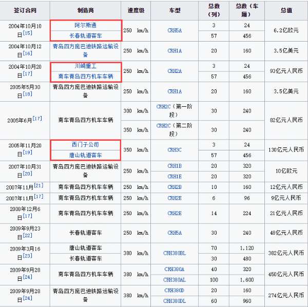 铁道部在2004年同时向当时全球高铁四大巨头:德国西门子、日本川崎重工、法国阿尔斯通和加拿大庞巴迪发出了邀请,表示对购买其高铁产品和技术“感兴趣”。