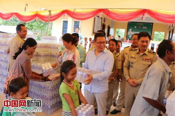 西港特区公司联合区内企业向柬埔寨当地旱灾灾民捐赠饮用水。图片由红豆集团提供。