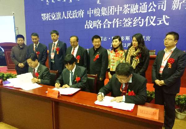 \u00A0\u00A0\u00A0 3月31日上午,鄂托克旗人民政府、中粮集团中茶融通公司和新宇力藻业集团战略合作签约仪式在鄂托克旗举行。战略合作协议签署后,双方将在茶与螺旋藻组合(茶多酚螺旋藻、绿茶螺旋藻等)的茶食品研发、生产与营销渠道拓展等方面展开深度合作,将合作开发的螺旋藻保健茶食品做为中粮集团的优质产品推向市场,在螺旋藻深加工、螺旋藻功能产品研发、螺旋藻国内国际著名品牌建设、打造百亿级销售额第度企业等方面共同推进,通过各种合作方式共同推动“世界藻都——中国·鄂托克——健康全世界”目标逐步实现。