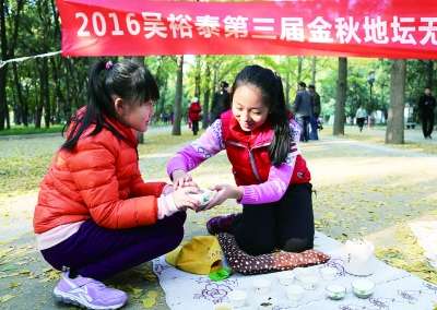 记者在现场看到,参与者们纷纷拿出自己携带的茶具和茶叶,跪坐在银杏大道上冲泡茶叶。两位吴裕泰的小学生粉丝,认真地品尝着从对方手中接过的茶,而他们每一个举手投足也成为摄影爱好者们争先捕捉的对象。