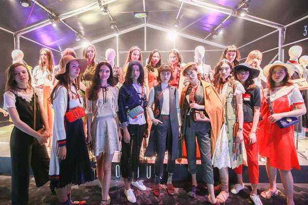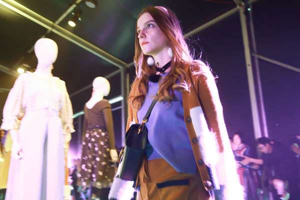 时装秀还未开始,舞台中央的模特就已经吸引了不少观众的注意。在我们以往的印象中,秀场都是T台形状,模特排成一线走秀。而三彩的这些模特有真人模特也有橱窗模特,并且排列成整齐的矩阵模式,让观众满怀好奇与新鲜感。