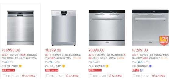 西门子和美的具有多年的家电制造经验,掌握着尖端的洗碗机制造技术。二者之间的科技力量对比并没有什么差别,但是价格上可是千差万别,你来看看京东上的价格。