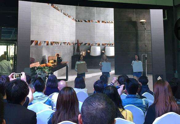 随后,是最为精彩的新品展示环节,充满异域风情的模特手持马可波罗瓷砖做现场展示,华耐家居集团瓷砖事业一部产品经理刘腾飞做现场解说。本场马可波罗瓷砖新品发布会共展示了包括工业风系列和真石系列的共十数款产品。包括工业风SOHO石、珍妮纺、泰特石以及真石奥特曼、菲亚米黄、云多拉灰等,让整个设计界为之眼前一亮。