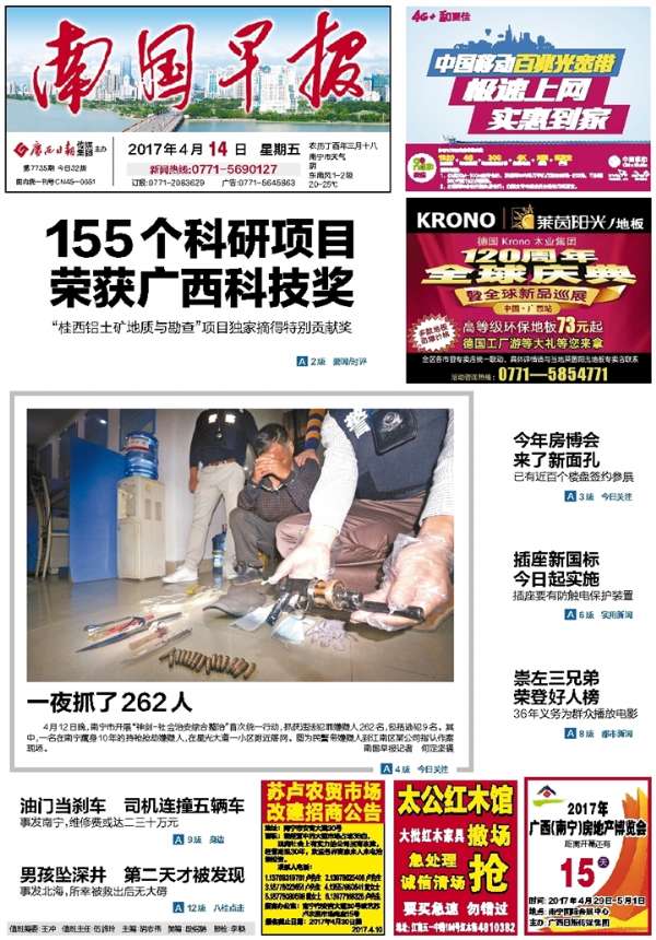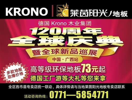 数字报首页 广西日报 南国早报 当代生活报 南国今报 南国城报 健报 广西画报 广西新闻网 2017年4月14日 <\u00A0上一期\u00A0\u00A0 下一期\u00A0>\u00A0\u00A0 按日期查找 本版导航 版面导航 搜索 第 A101 版主要新闻 3上一篇\u00A0\u00A0 下一篇4\u00A0\u00A0 字体: 放大 默认 缩小 \u00A0\u00A0\u00A0\u00A0 [本版导航] [返回首页] 莱茵阳光地板 南国早报\u00A0\u00A0 2017-04-14\u00A0\u00A0\u00A0\u00A0 \u00A0\u00A0\u00A0\u00A0 3上一篇\u00A0\u00A0 下一篇4\u00A0\u00A0 字体: 放大 默认 缩小 \u00A0\u00A0\u00A0\u00A0 [返回页顶] [返回首页] 版面导航 第A101版:要闻 第A102版:要闻/时评 第A103版:今日关注 第A104版:今日关注 第A105版:今日关注 第A106版:实用新闻 第A107版:都市新闻 第A108版:都市新闻 第A109版:身边 第A110版:政法新闻 第A111版:广告 第A112版:八桂点击 第A113版:互动市民之声 第A114版:报网联动 第A115版:时事·纵览 第A116版:时事·万象 第A117版:财经·要闻·福彩 第A118版:财经·证券 第A119版:消费导购 第A120版:消费导购·潮流 第A121版:教育新闻 第A122版:体育新闻·体彩 第A123版:文体新闻·资讯·健康周刊 第A124版:健康周刊 第A125版:健康·综合 第A126版:家居周刊 第A127版:家居周刊·家装监理 第A128版:家居周刊·重点关注 第A129版:家居周刊·消费维权 第A130版:家居周刊·早报验房 第A131版:分类信息 第A132版:家居周刊·美居风尚