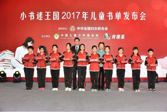 在启动仪式现场,赵东花、朱锡生、黄进栓,北京肯德基有限公司总经理赵莉,以及儿童阅读专家代表由儿童文学作家、教育学家、艺术家、科学家、心理学家、儿童图书馆馆长等专家组成的儿童阅读顾问团共同发布“小书迷王国2017年儿童书单”,并向留守儿童“小候鸟“代表赠书。