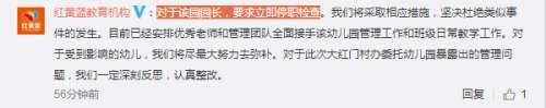 对此,微博认证为北京红黄蓝儿童教育科技发展有限公司的@红黄蓝教育机构在今日回复称,对于该园园长,要求立即停职检查。我们将采取相应措施,坚决杜绝类似事件的发生。目前已经安排优秀老师和管理团队全面接手该幼儿园管理工作和班级日常教学工作。对于受到影响的幼儿,我们将尽最大努力去弥补。对于此次大红门村办委托幼儿园暴露出的管理问题,我们一定深刻反思,认真整改。