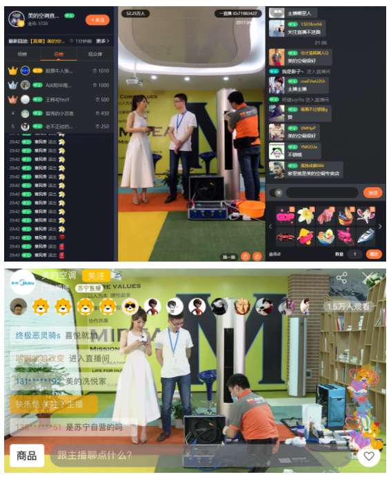 4月18日当晚,美的与苏宁易购联手直播的“一起来电 美的空调”的内容也是看点十足!广东电视台美女主持人毛琳前一刻还是人民的使者,现场直问美的空调工程师一些犀利尖锐的问题;后一秒又变身为美的睿行空调的超级迷妹,对其“自清洗”、“防霉除菌”、“除PM2.5”、“超静音”等黑科技赞不绝口。